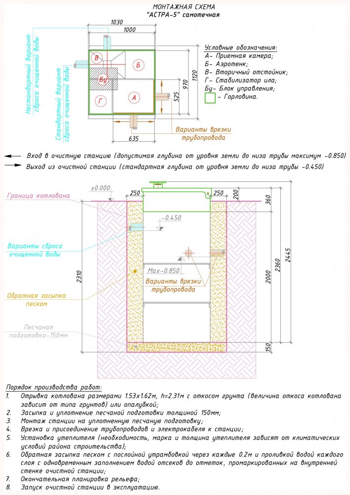 Для начала выкапывается котлован на 15 см больше, чем размеры самой установки, и траншеи для подведения трубы и электрического кабеля. Далее септик опускается в котлован, к нему подключаются трубы и кабель, а после он заполняется водой с попеременным обсыпанием песком. Выполняются пусконаладочные работы.
