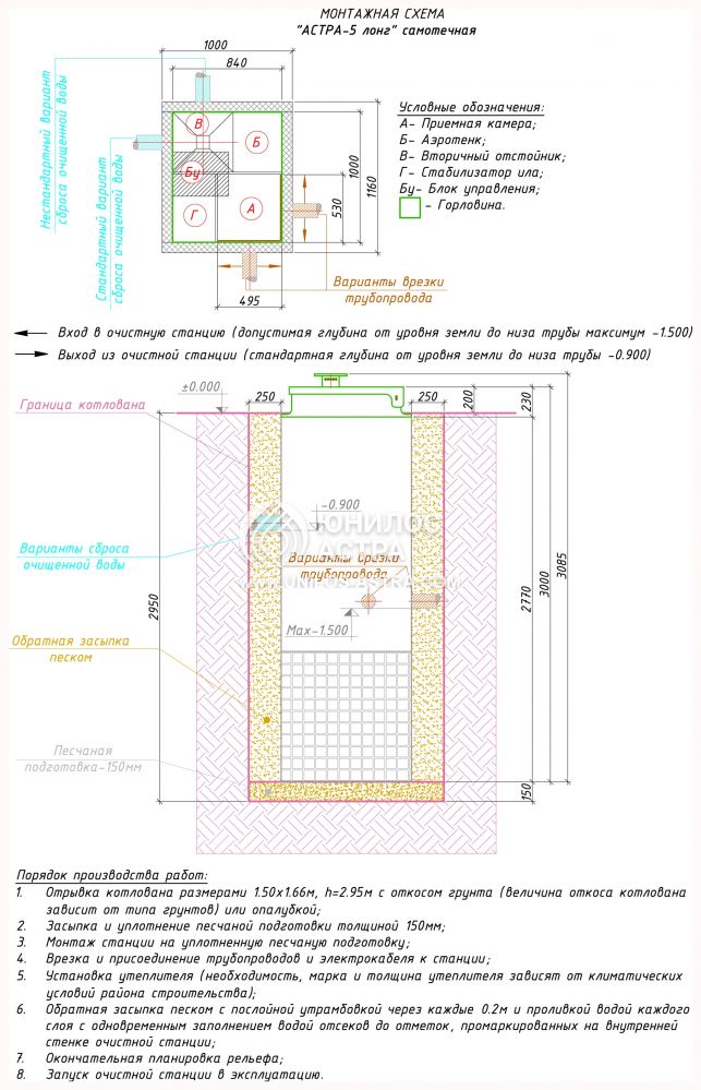 Очистка в септике Астра 5 long производится по той же схеме, что и у большинства аналогичных моделей. Стоки по проложенным трубопроводам направляются в септик. Здесь они попадают и накапливаются в приемном отсеке. Происходит тщательное перемешивание, разделение крупных взвесей на мельчайшие фракции. Далее, подготовленная однородная масса направляется в аэротенк. Здесь под воздействием активного ила, насыщенного кислородом, происходит перемешивание, активные компоненты ила нейтрализуют органические вещества, находящиеся в сточных массах. Далее жидкость перемещается в отстойник. Здесь ил оседает на дно, а очищенные, осветленные водные массы отстаиваются. Далее активный ил возвращается в аэротенк, а вода направляется по отводящим трубам выводится из септика.