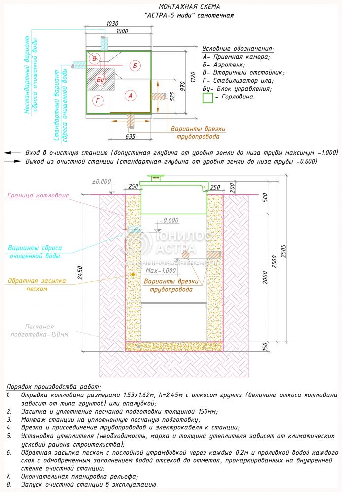 Если вы решили установить септик Астра 5 Миди самостоятельно, выполните работы в следующем порядке: